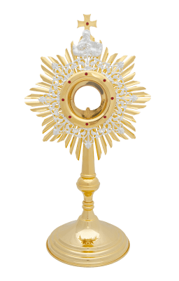 Monstrancja wykonana jest z mosiądzu, pozłacana. Wizerunki roślinne oraz Boga Ojca posrebrzane. Pierścień przedni monstrancji zdobiony kamieniami.
